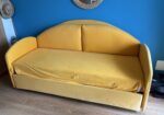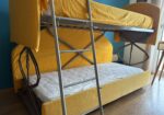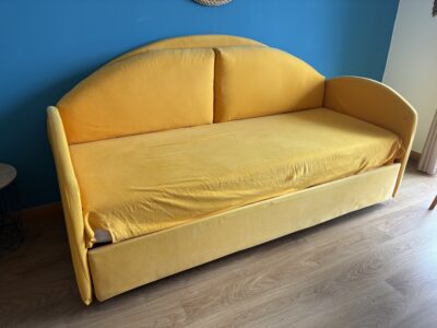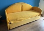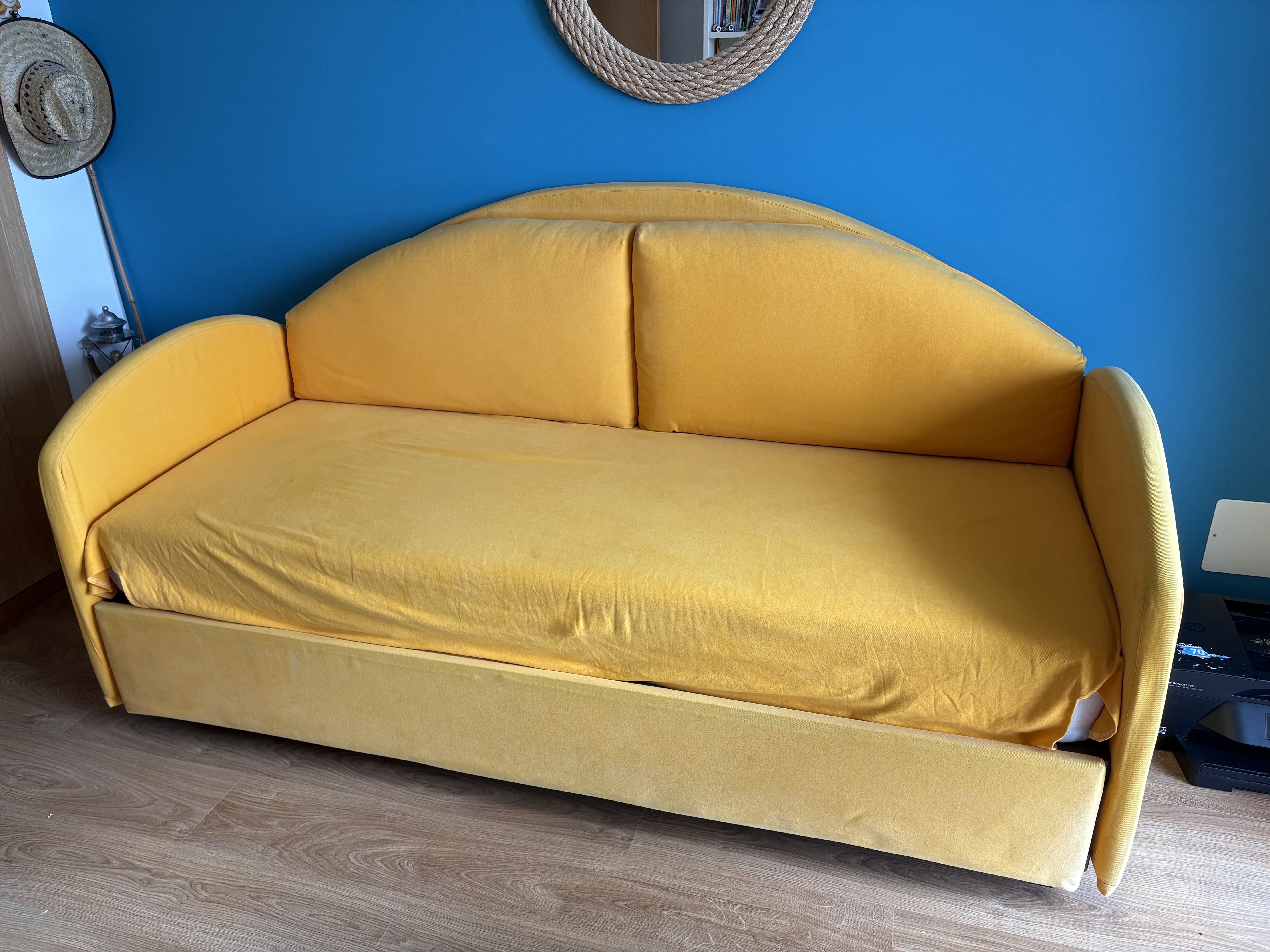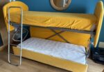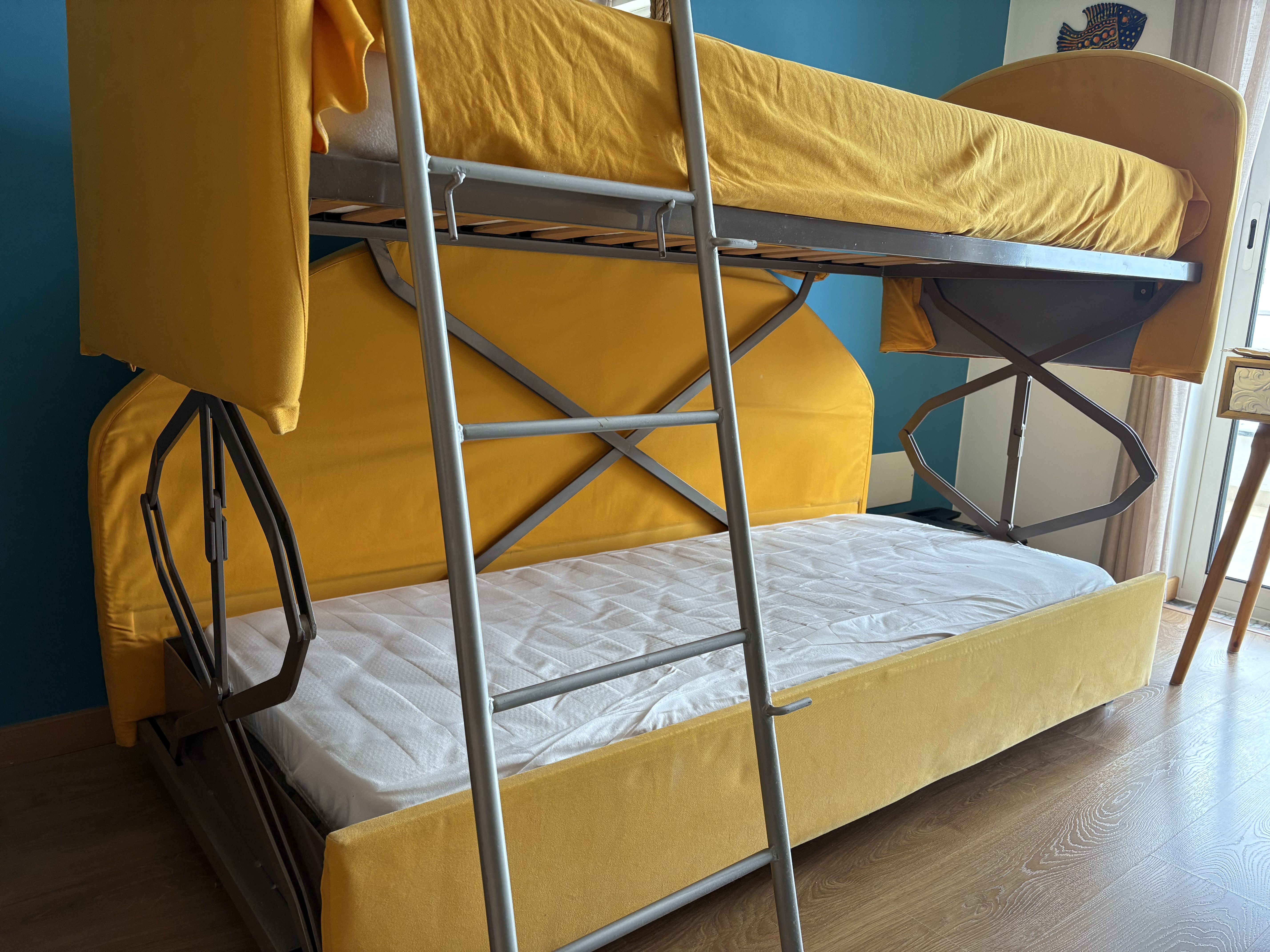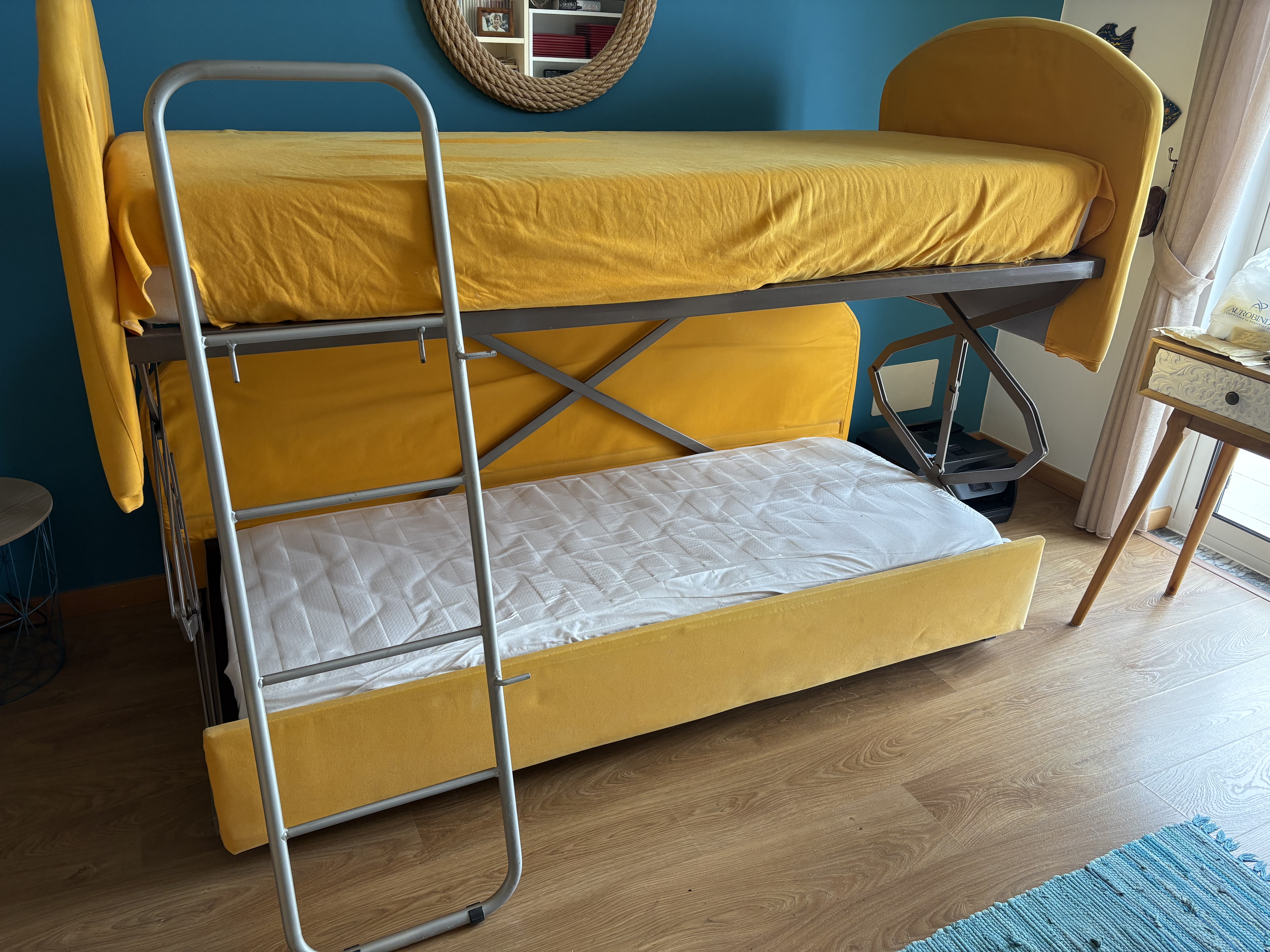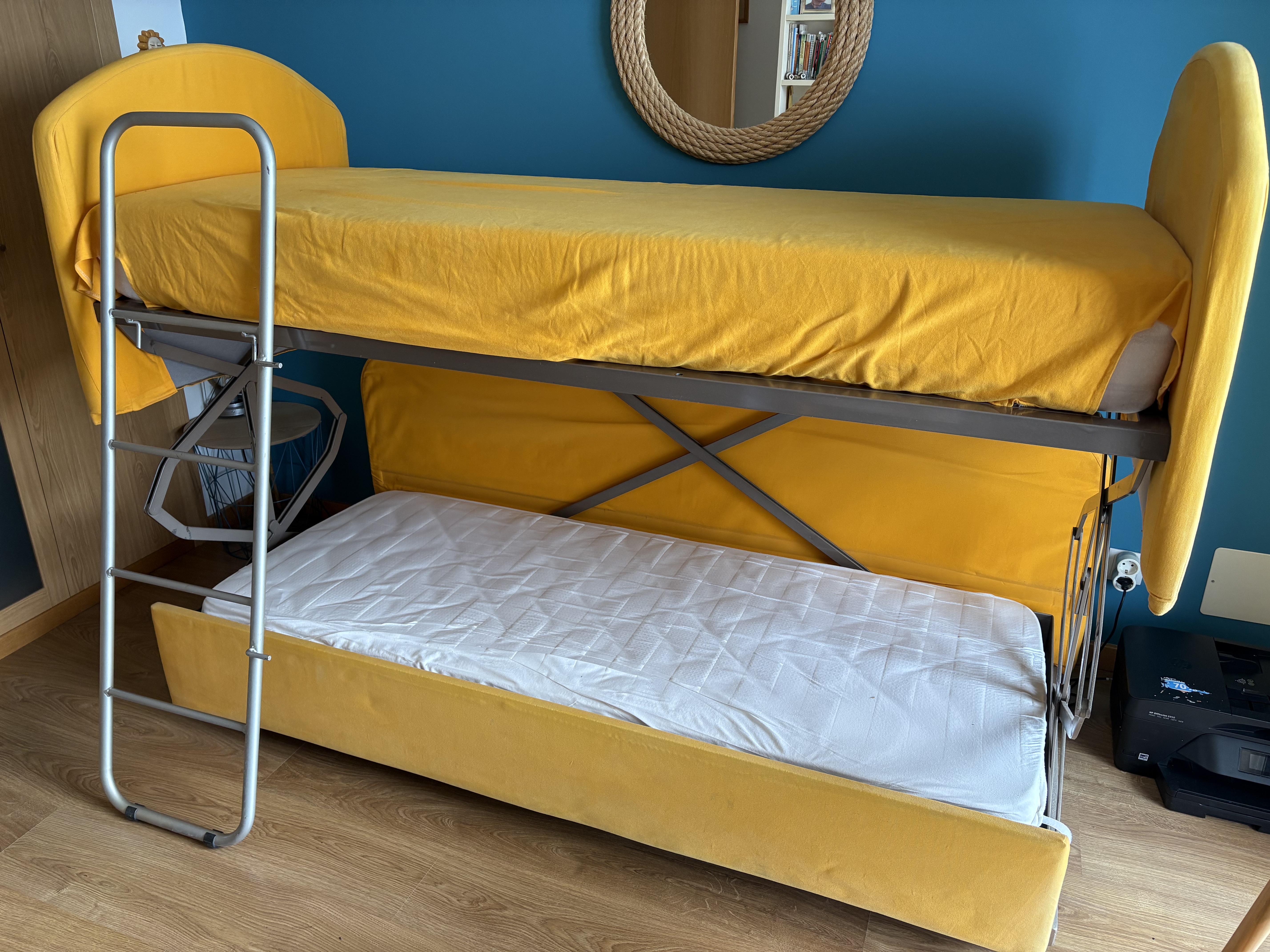 Fabriqué en Italie, ce canapé-lit superposé possède une structure en acier avec système de sécurité antidérapant. Sommier à lattes en bois. Revêtement en tissu entièrement déhoussable. Comprend deux matelas (supérieur et inférieur), une échelle et une barrière latérale en acier. Dimensions : largeur 199 cm, profondeur 93 cm, hauteur maximale fermée 108 cm, largeur des accoudoirs 5 cm.
