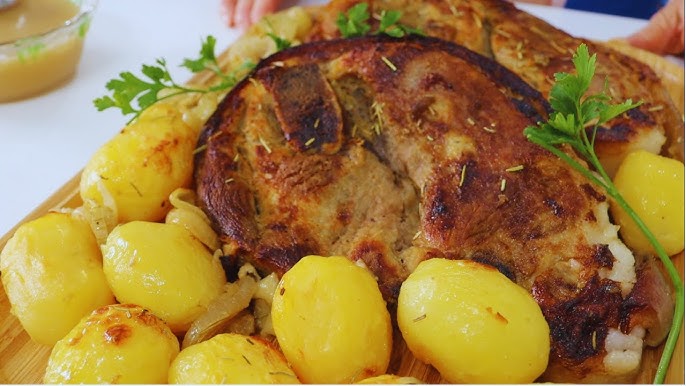 Plat principal : Cuisses de porc rôties et pommes de terre au four avec salade